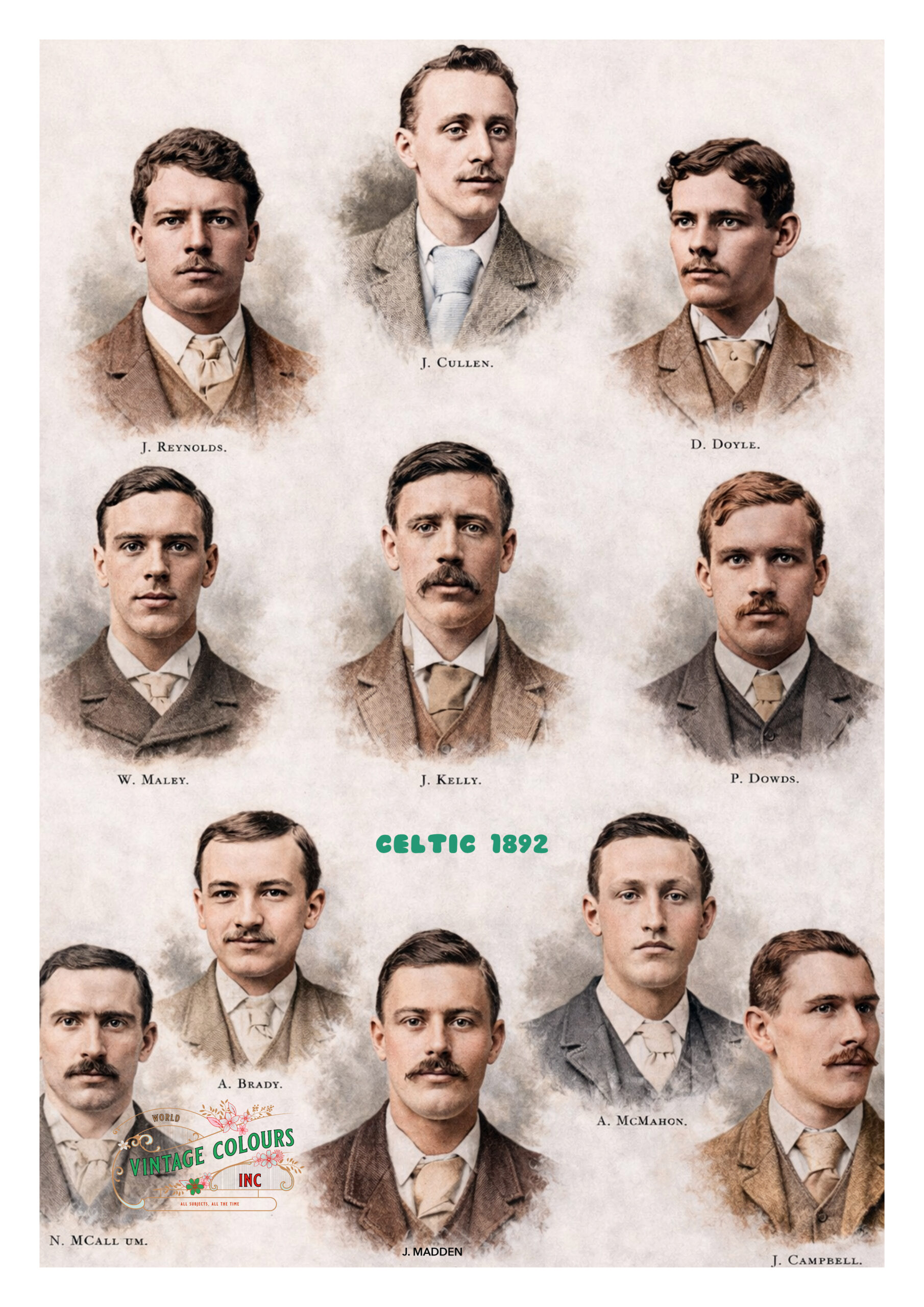 At the centre of the composition sits J. Cullen, visually anchoring the group, while figures such as J. Reynolds, D. Doyle, J. Kelly, W. Maley, P. Dowds, A. Brady, N. McCallum, J. Madden, A. McMahon, and J. Campbell surround him. Together, they represent the core of a side that helped carry Celtic from promising newcomer to established contender.