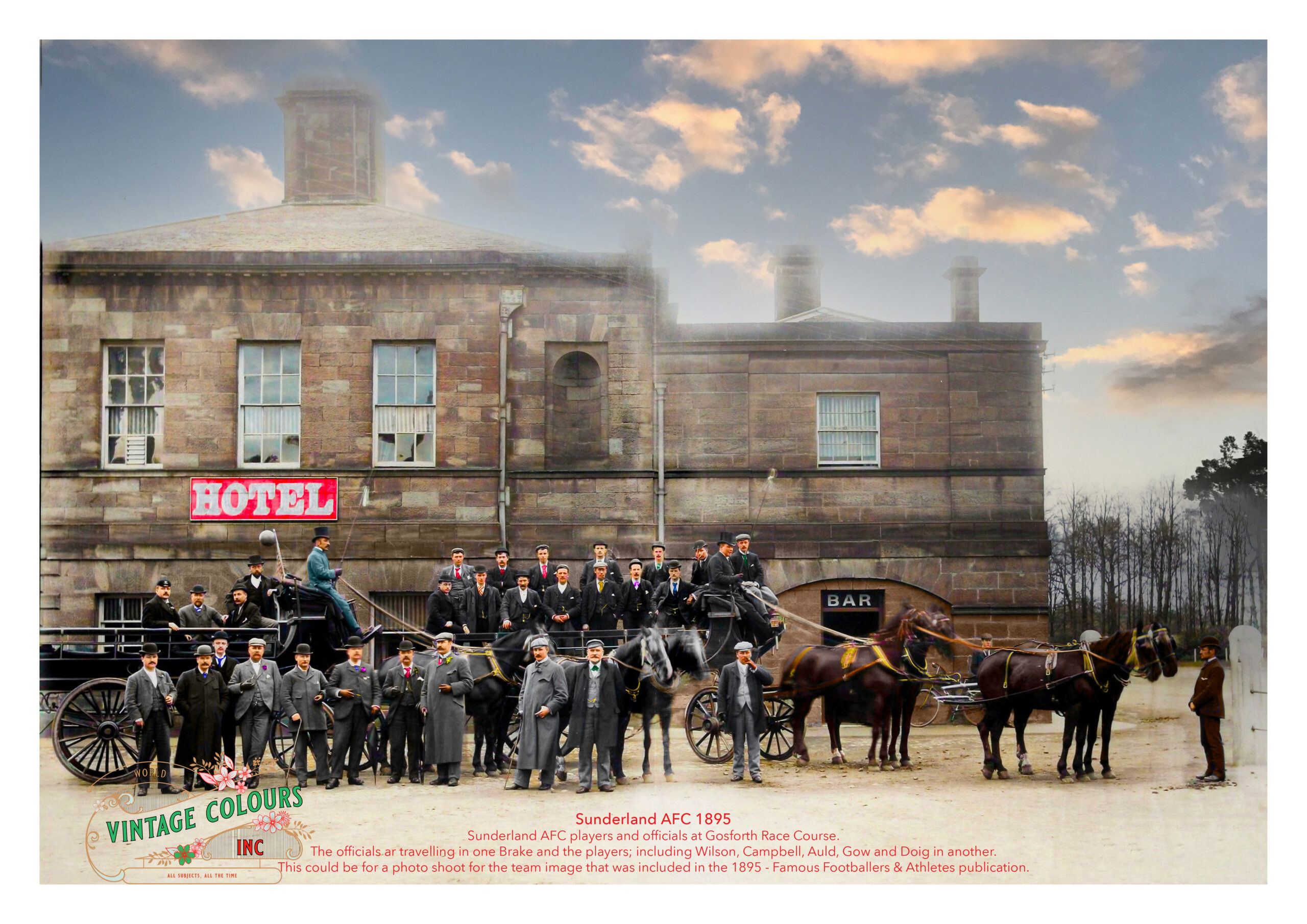 Beautiful colourised print of the Sunderland AFC team and officials at Gosforth Race Course having just had their pictures taken for the Famous footballers & Athletes publication, with the League Championship Trophy. A wonderful and evocative image.