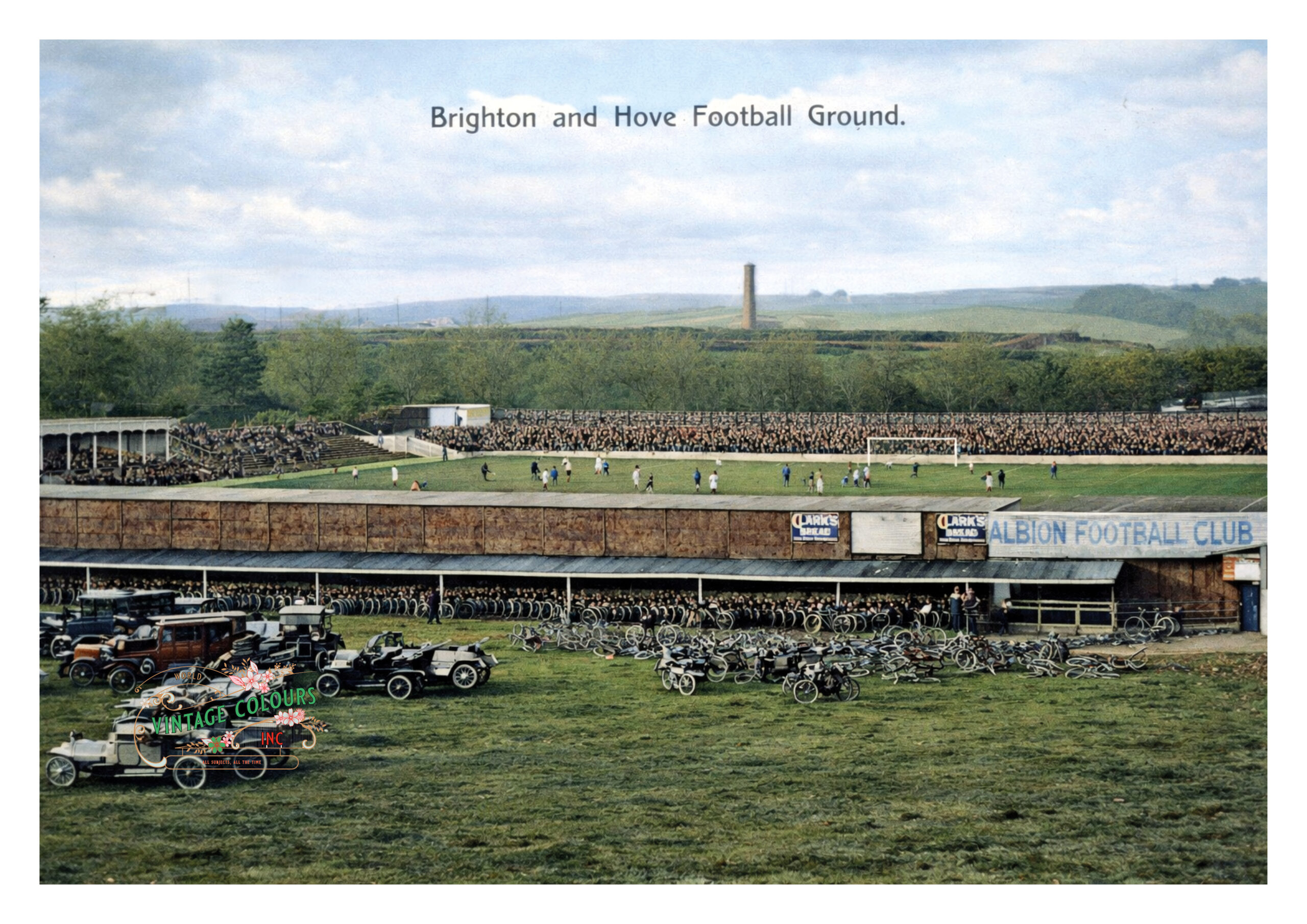 This exceptional colourised photograph captures the Goldstone Ground in 1914, at the height of its importance as the home of Brighton & Hove Albion and on the eve of a momentous interruption to English football history.